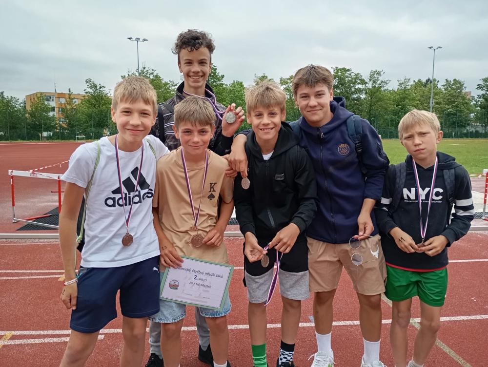 Pětičlenné školní týmy závodily v těchto disciplínách - 60m, skok daleký/skok vysoký, hod míčkem a vytrvalostní běh 600m dívky a 800m chlapci. Naše škola postavila v každé kategorii dva týmy. Mladší žákyně se opravdu skvěle předvedly a obsadily první místo. Ani chlapci nezklamali a skončili na druhém místě. V individuálních výkonech nejvíce uchvátily výsledky ve skoku vysokém Diany Samcové, která skočila 136 cm a Dana Buchty ve skoku dalekém výkonem 416 cm.