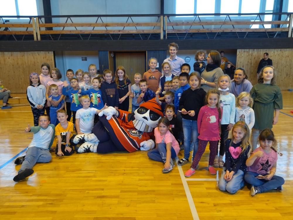 Odpolední zábava v tělocvičně s maskotem chomutovských hokejistů- Picaroonem.