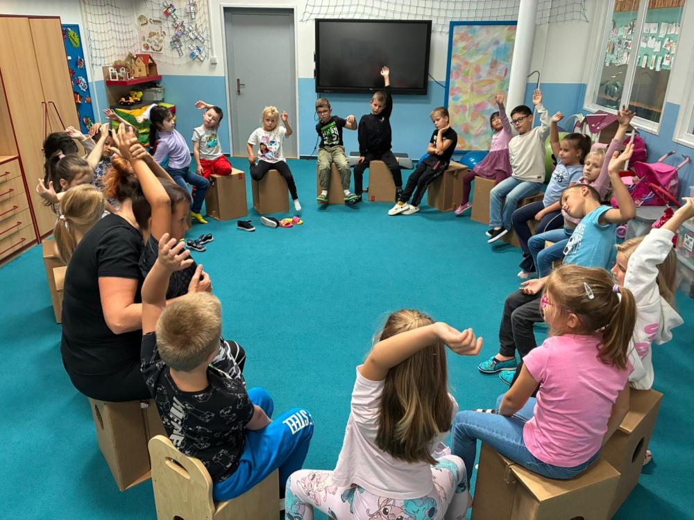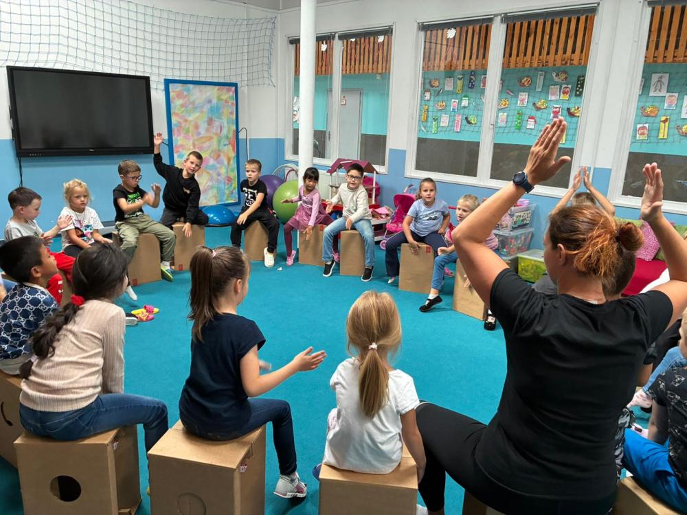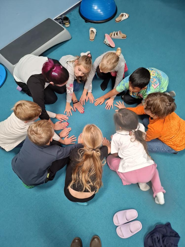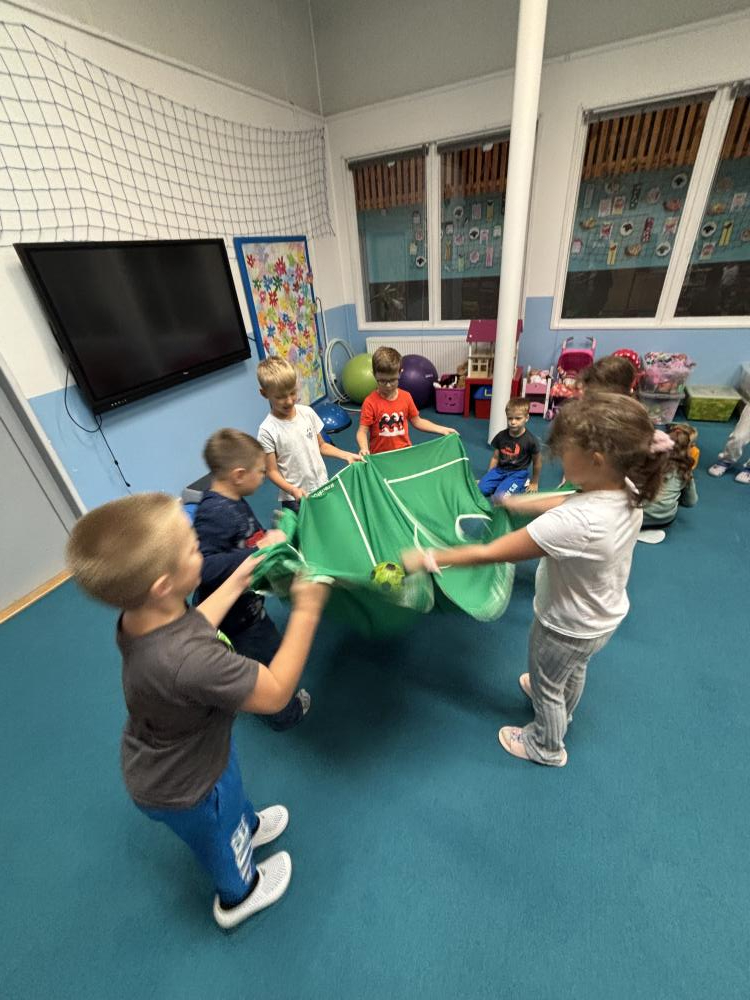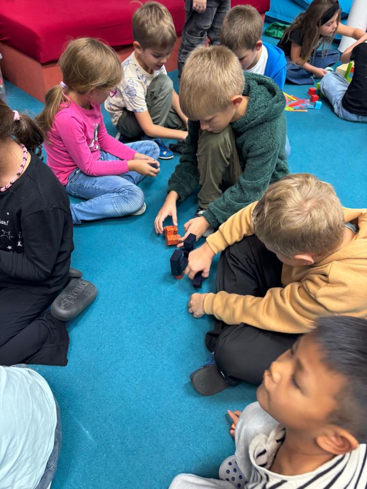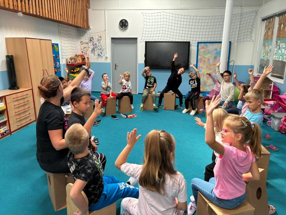 Nechyběly ani hudební chvilky. Děti si vyzkoušely hru na cajony, kde si společně zabubnovaly do rytmu známých písniček. V průběhu měsíce jsme se také učili nové básničky, které dětem pomáhají rozvíjet paměť a výslovnost. Protože pohyb je pro nás důležitý, hráli jsme různé pohybové hry a tancovali při oblíbených písničkách.