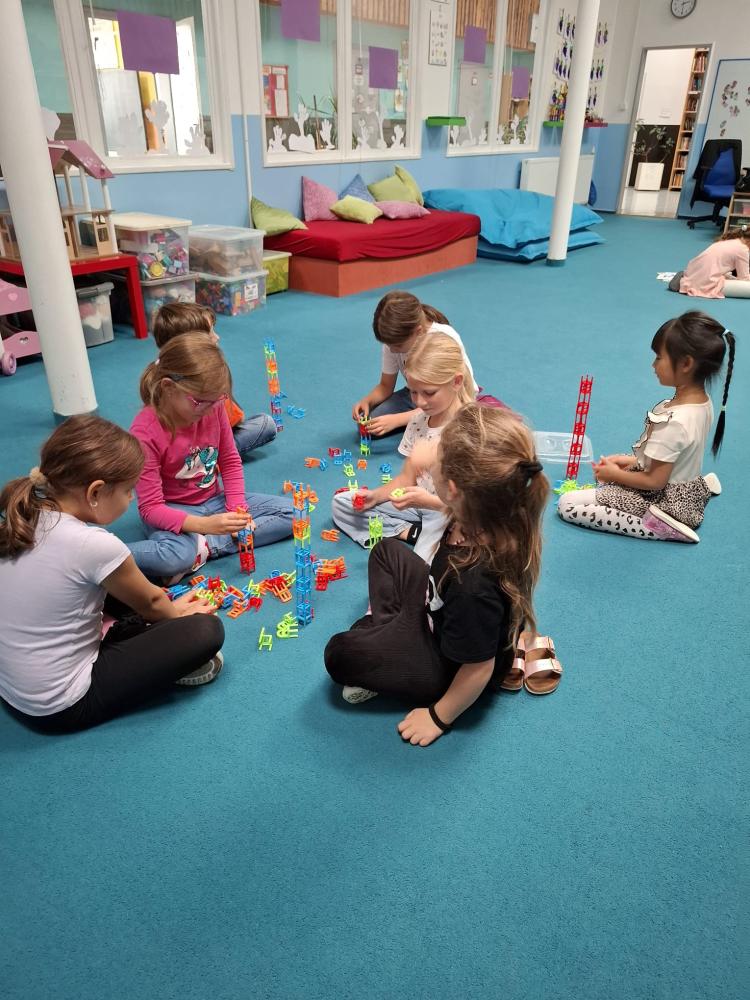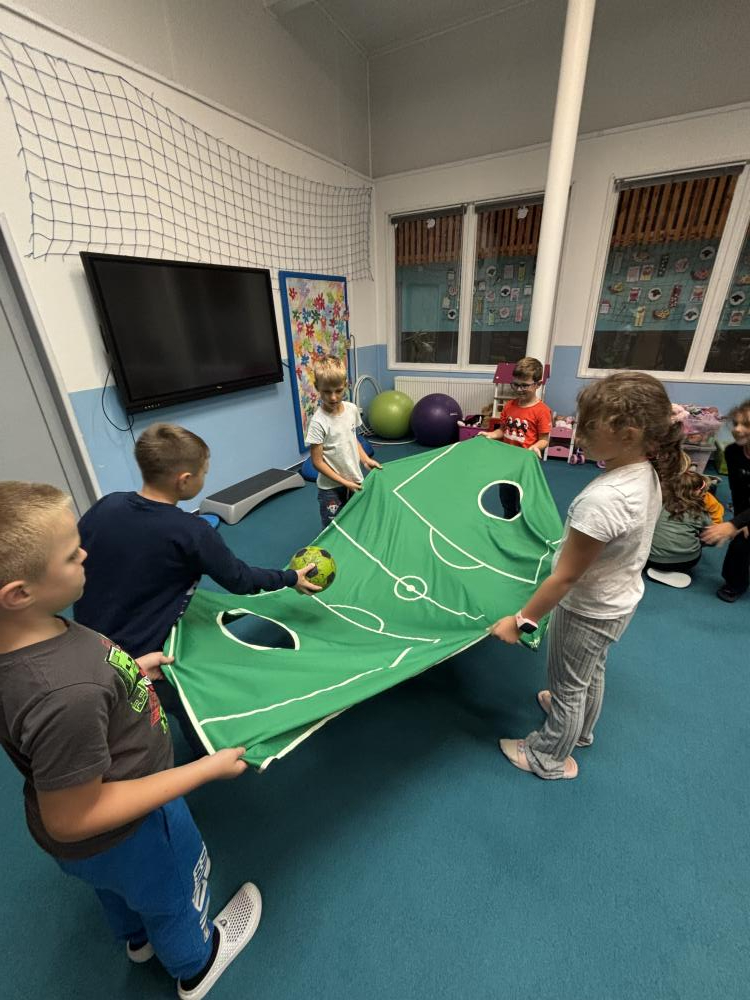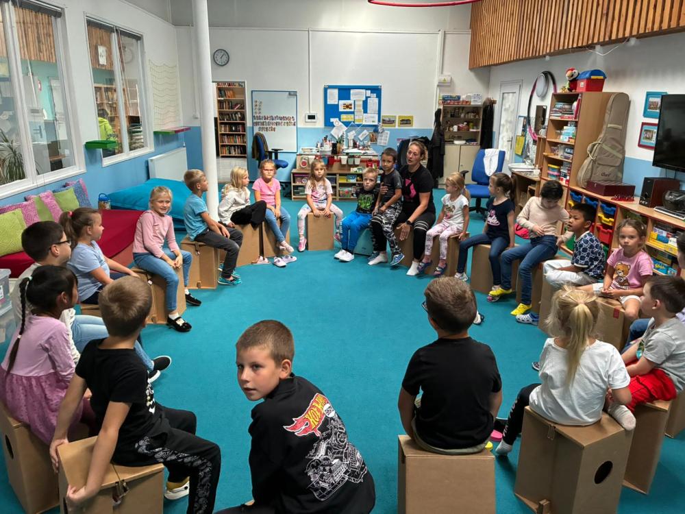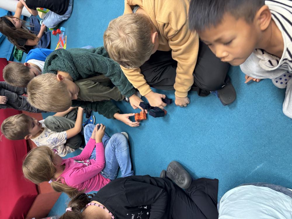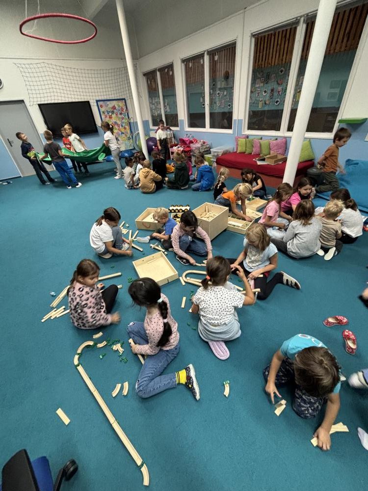 Nechyběly ani hudební chvilky. Děti si vyzkoušely hru na cajony, kde si společně zabubnovaly do rytmu známých písniček. V průběhu měsíce jsme se také učili nové básničky, které dětem pomáhají rozvíjet paměť a výslovnost. Protože pohyb je pro nás důležitý, hráli jsme různé pohybové hry a tancovali při oblíbených písničkách.