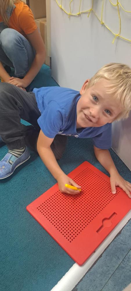 Velkým zážitkem pro děti byla návštěva pana Kanty, který nám přivezl ukázat své originální hry a hračky. Děti si je mohly nejen prohlédnout, ale i samy vyzkoušet, což je velmi bavilo. Celý měsíc se nesl v příjemné atmosféře tvořivosti, radosti a fialové barvy, která nám připomínala podzimní kouzlo října.