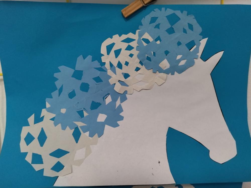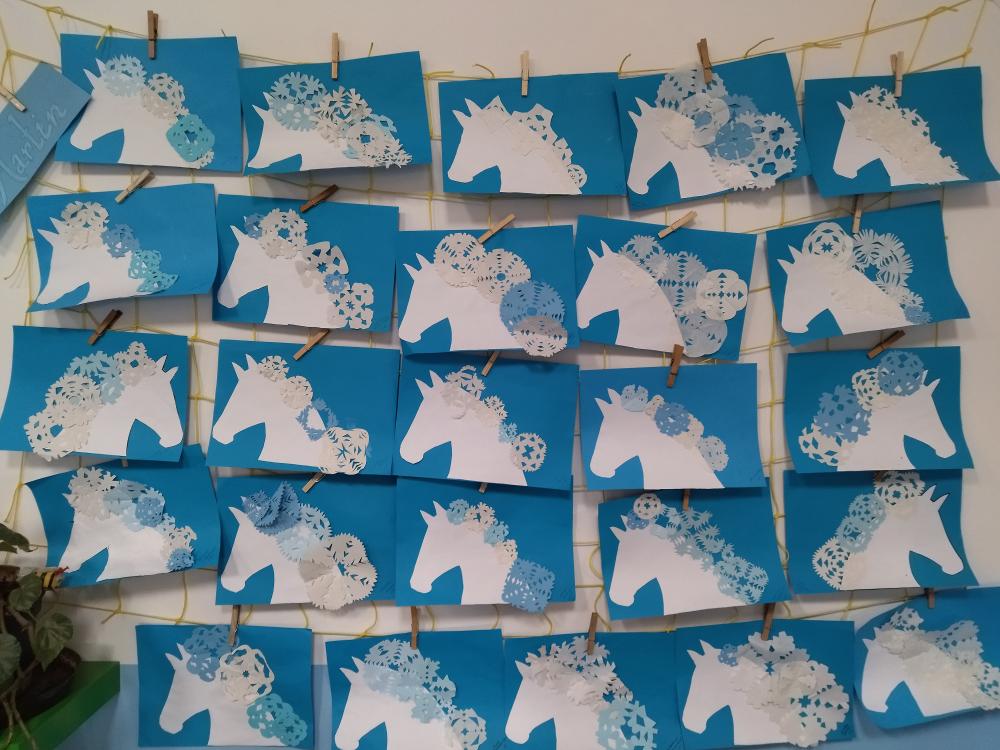Svatý Martin přijíždí na bílém koni. Jak to bylo se svatým Martinem, pláštěm a husou, jsme se dozvěděli z četby. Sníh nenapadl, tak jsme se museli spokojit jen s pohádkou, pranostikami, tvořením papírových vloček a výrobou koníků.